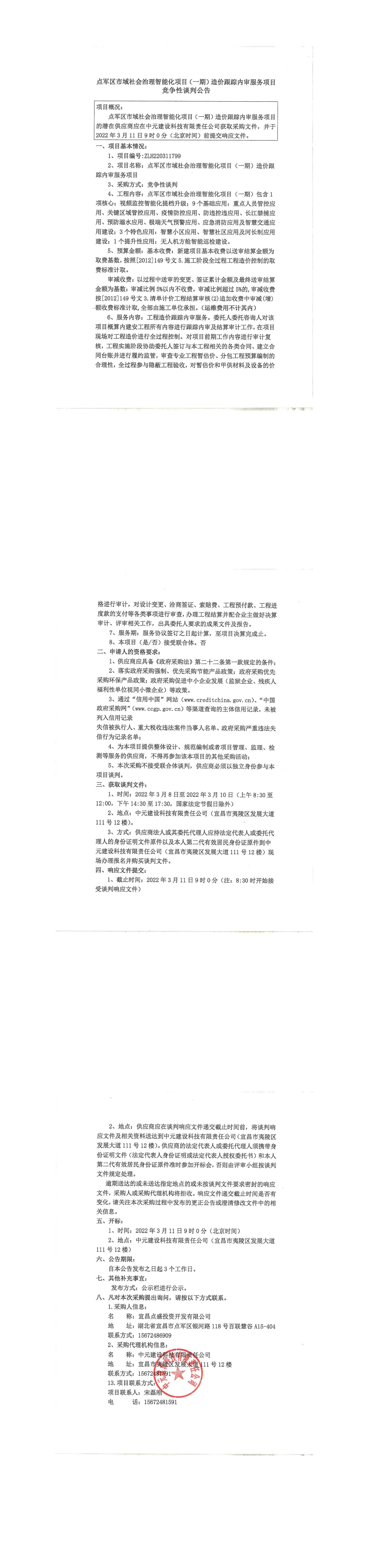 點軍區(qū)市域社會治理智能化項目(一期)造價跟蹤內(nèi)審服務項目談判公告