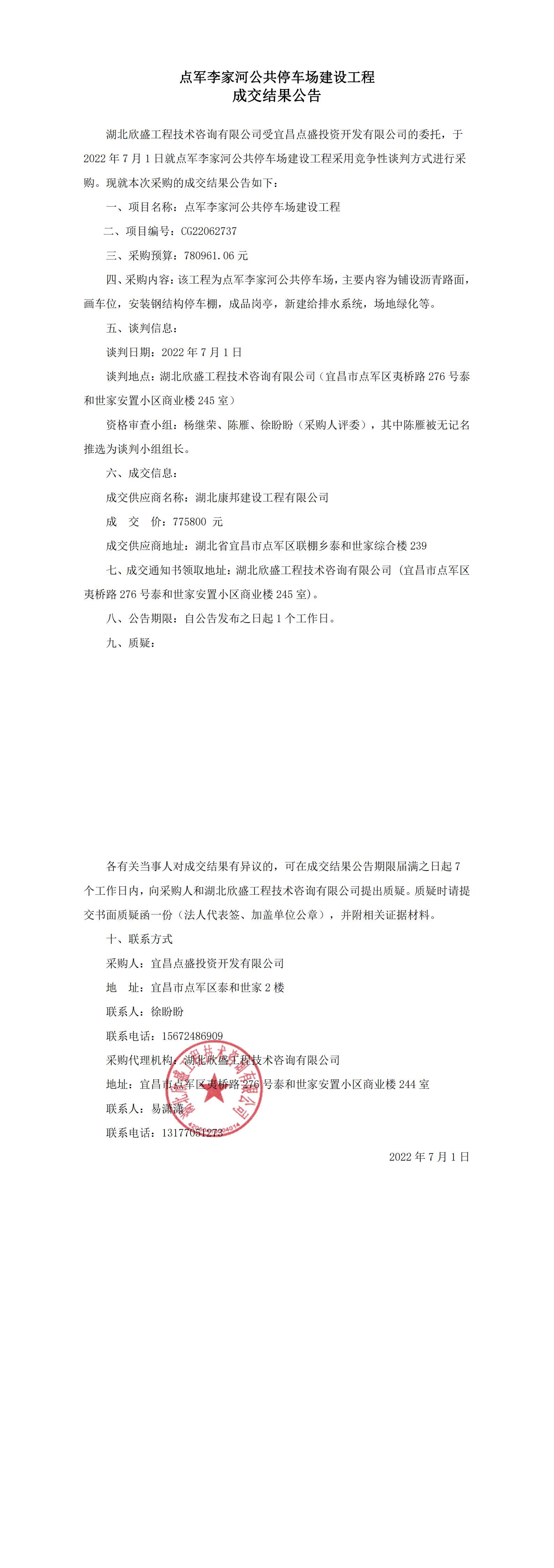 點(diǎn)軍李家河公共停車場建設(shè)工程成交結(jié)果公告