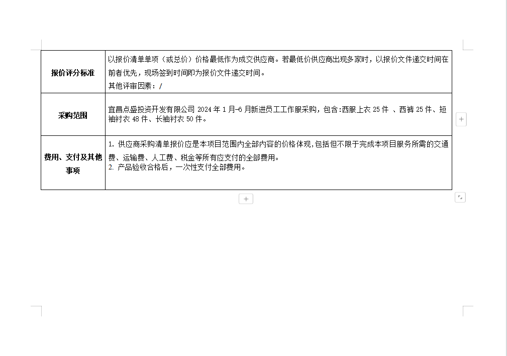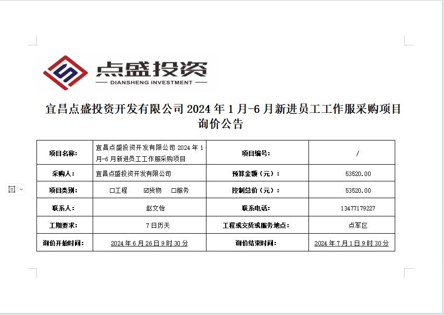 宜昌點(diǎn)盛投資開發(fā)有限公司2024年1月-6月新進(jìn)員工工作服采購項(xiàng)目詢價(jià)公告