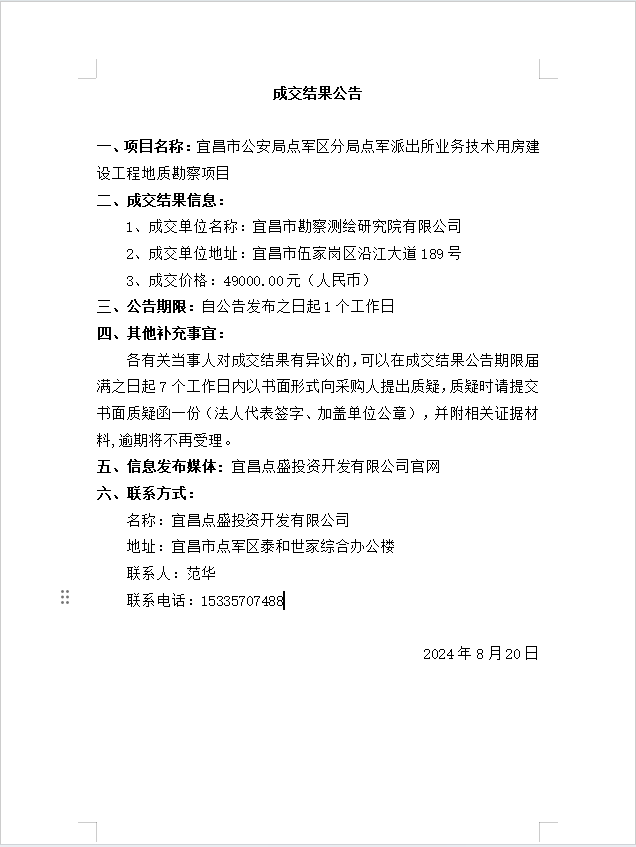 宜昌市公安局點軍區(qū)分局點軍派出所業(yè)務技術用房建設工程地質勘察項目成交公告