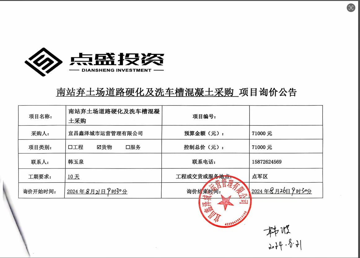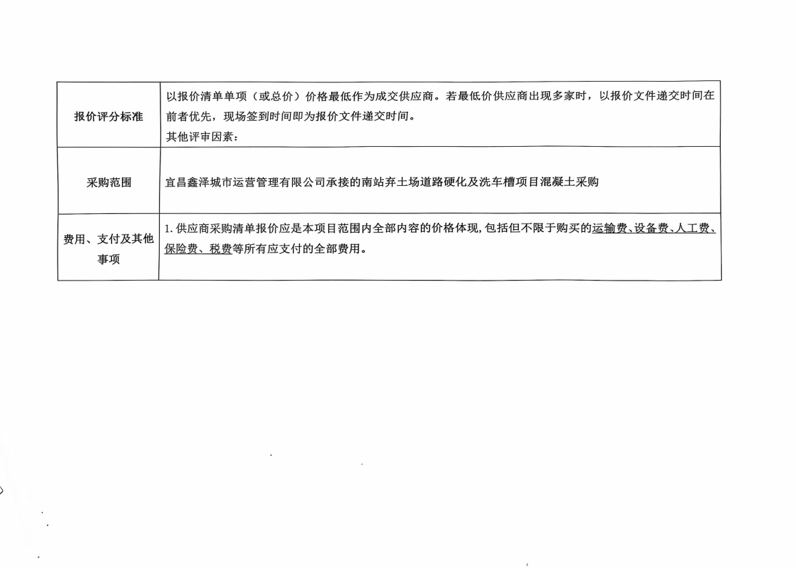 宜昌鑫澤城市運(yùn)營管理有限公司南站棄土場(chǎng)道路硬化及洗車槽混凝土采購項(xiàng)目詢價(jià)公告