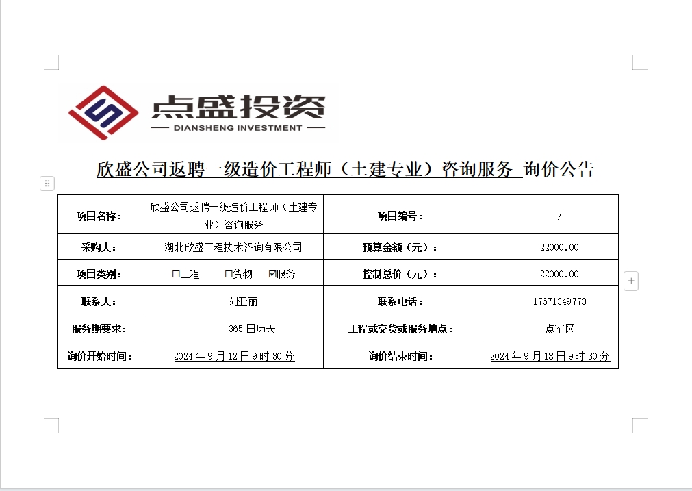 欣盛公司返聘一級(jí)造價(jià)工程師(土建專業(yè))咨詢服務(wù)詢價(jià)公告
