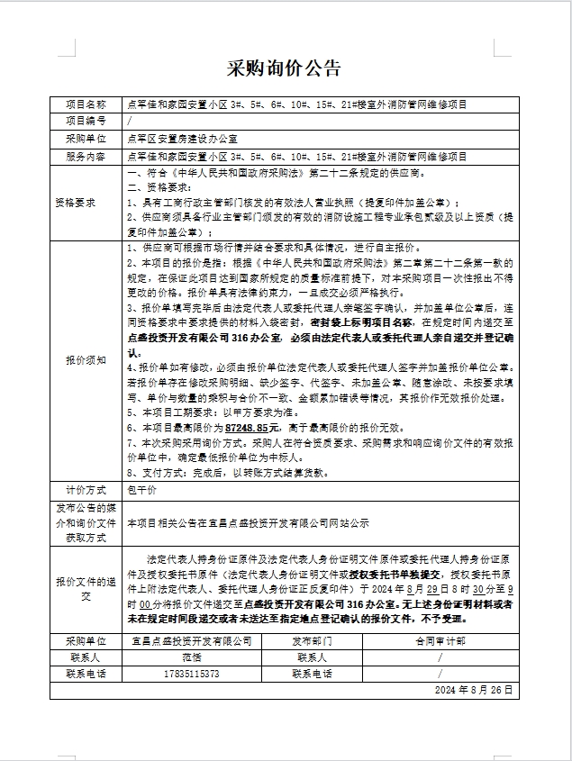 點(diǎn)軍佳和家園安置小區(qū)3#、5#、6#、10#、15#、21#樓室外消防管網(wǎng)維修項(xiàng)目詢(xún)價(jià)公告