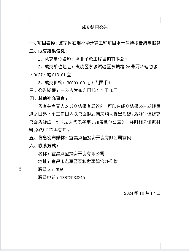 點軍區(qū)石堰小學遷建工程項目水土保持報告編制服務成交公告