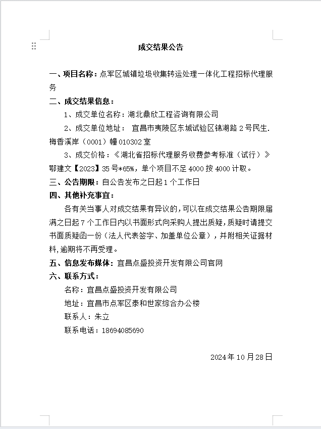 點軍區(qū)城鎮(zhèn)垃圾收集轉運處理一體化工程 招標代理服務成交公告