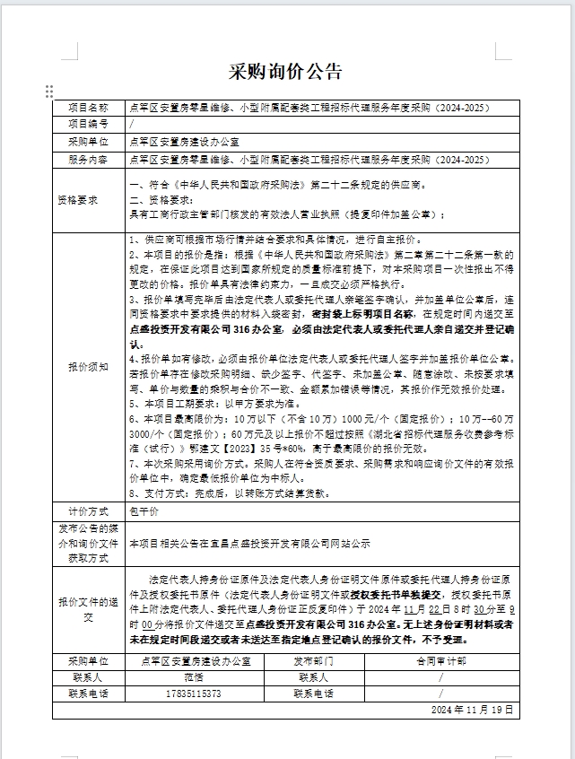 點(diǎn)軍區(qū)安置房零星維修、小型附屬配套類工程招標(biāo)代理服務(wù)年度采購(2024-2025)詢價公告