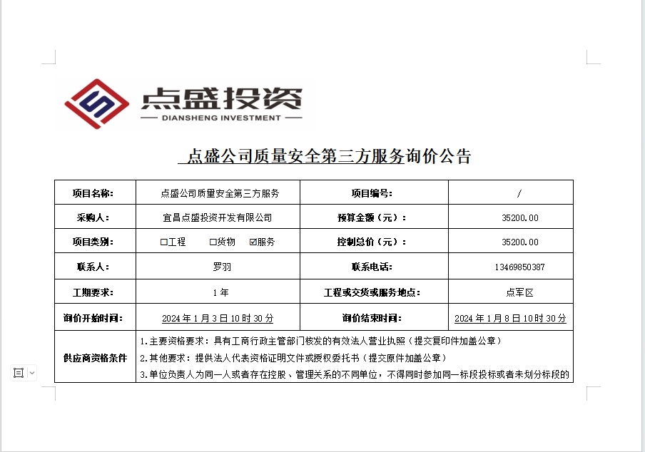 點盛公司質(zhì)量安全第三方服務詢價公告